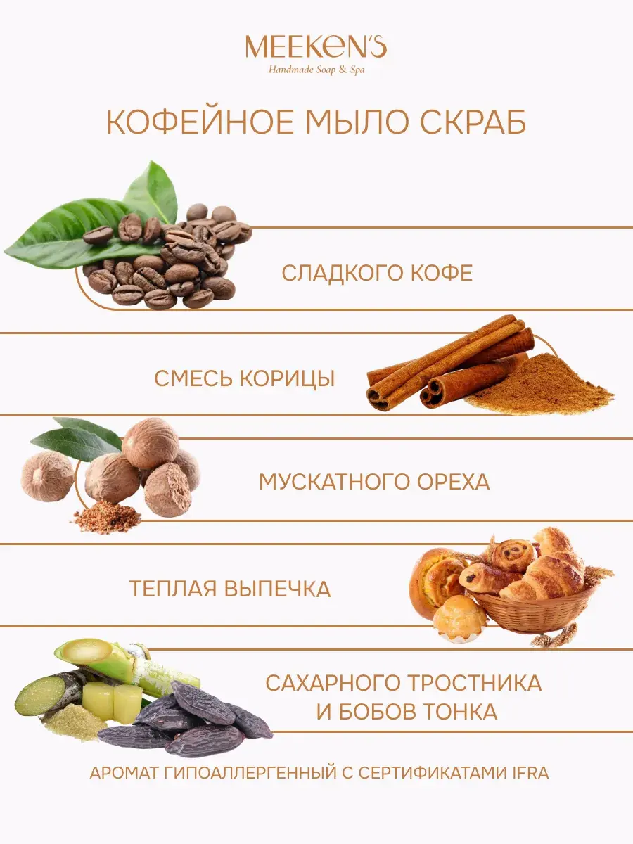 Кофейное мыло-скраб с маслом какао и маслом Ши от бренда MEEKEN'S представляет собой эксклюзивное косметическое средство для ухода за кожей. Оно создано на основе натурального масла и молотого кофе.Аромат сладкого кофе, смесь корицы, мускатного ореха, свежесваренного кофе, теплой выпечки, сахарного тростника и бобов тонка, точно не оставит вас равнодушными. • Состав: омыленные масла (оливковое, миндальное, кокосовое, пальмовое, ши, касторовое, какао), молотый кофе, лактат натрия, цитрат натрия, тертое какао, ароматическое масло. • Вес: 120 грамм (+/- 10 гр) • Рекомендации по уходу: Необходимо использовать мыльницу с оттоком воды.