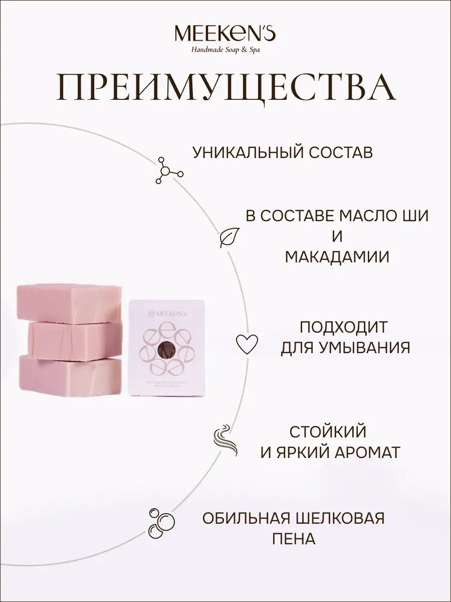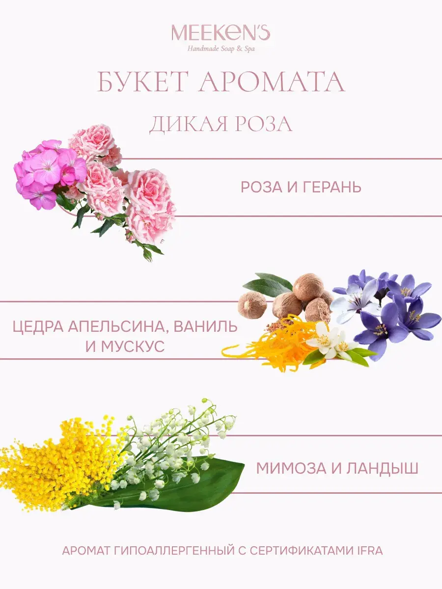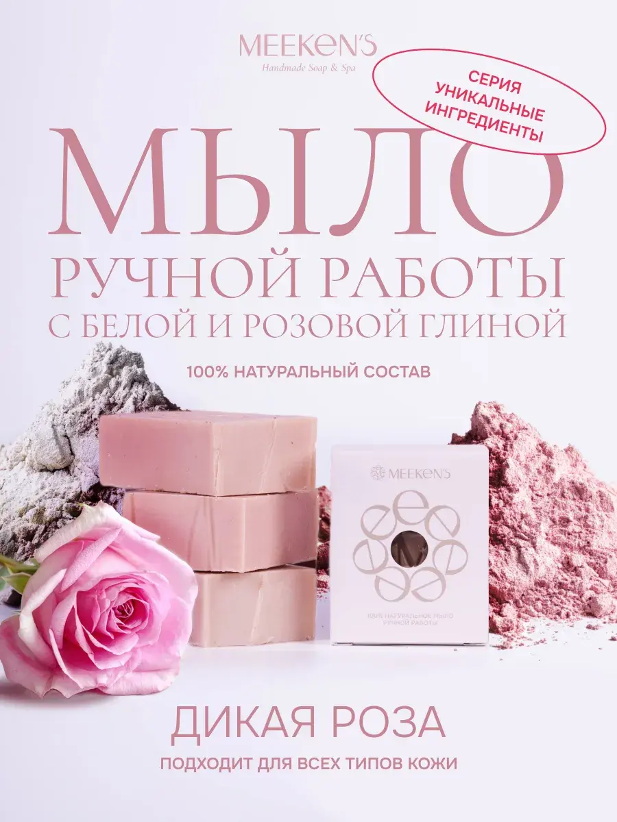 Мыло «Дикая роза» от бренда MEEKEN'S представляет собой эксклюзивное косметическое средство для ухода за кожей с маслом Ши и макадамии. Мыло «Дикая роза» с белой и розовой глиной, обладает обильной шелковой пеной, благодаря глинам мельчайшего помола не стягивает кожу и не царапает во время использования. Подходит для ежедневного использования, помогает устранить сухость и раздражение, оставляя кожу гладкой и благоухающей. Свойства глин в составе: • Белая глина (каолин) - вбирает в себя избыток кожного сала устраняет загрязнения , усиливает бактерицидное действие. • Розовая глина - благодаря сбалансированному минералогическому и химическому составу глина восстанавливает и стабилизирует работу клеток кожи, является одним из сильнейших природных средств при борьбе с раздражениями кожи.